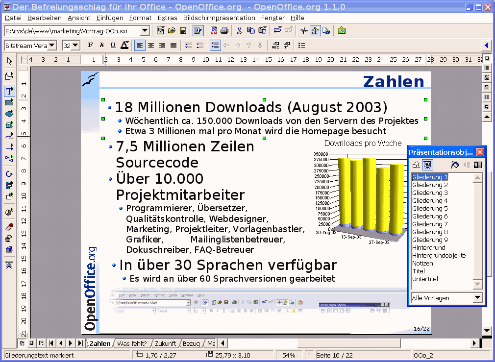 Grafik10 OpenOffice.org 1.1 führt neuartige Funktionalität, wie etwa bidirektionales und vertikales Schreiben - wie es in vielen Sprachen gebräuchlich ist - ein. Dies ermöglicht die Übersetzung von OpenOffice.org 1.1 in japanisch, hebräisch und viele andere Sprachen, die unterschiedliche Anforderungen an das Text-Layout stellen. Außerdem verfügt das OpenOffice.org Projekt über eine steigende Zahl von muttersprachlichen Projekten, wo Nutzer Zugriff auf Informationen bezüglich OpenOffice.org in ihrer eigenen Muttersprache haben.