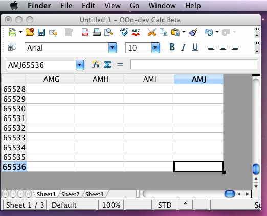 1024 Columns Per Calc Sheet (Instead of 256)With support for 1024 columns; OpenOffice.org 3.0 can now handle significantly more data than before. Previous versions only supported 256 columns. |