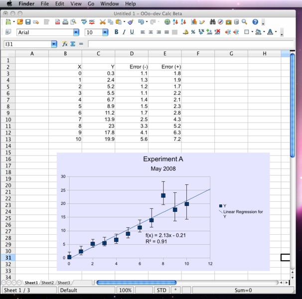 Chart EnhancementsMany OpenOffice.org users requests support for displaying custom error bars and regression equations. The OpenOffice.org developer community including Sun listened to these users and added these highly desired features to OpenOffice.org 3.0. Thus; now it's possible to draw error bars based on error ranges provided in spreadsheet cells. In addition, it is possible to display regression equations as well as correlation coefficients. |
