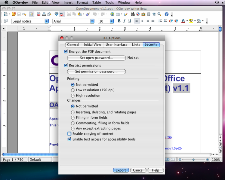 Enhanced PDF ExportThe PDF export feature in OpenOffice.org provides a huge set of formatting and security options; so that PDF files can be customized for many different scenarios. |