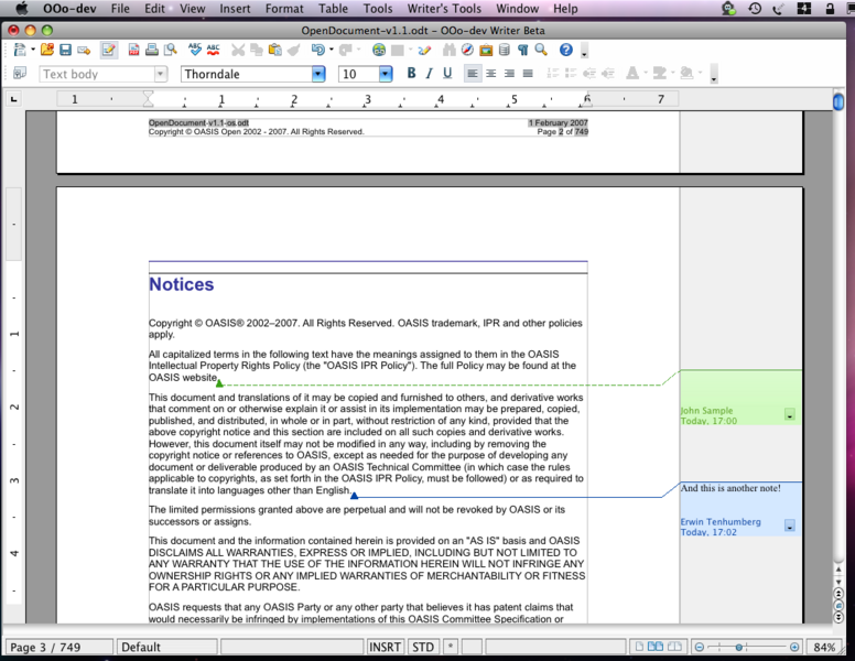Improved Notes Feature in WriterIn the past; notes in OpenOffice.org were just displayed as small yellow rectangles within the text. This was not very intuitive and user friendly. With version 3.0, OpenOffice.org got an advanced notes features which displays notes on the side of the document. This makes notes a lot easier to read. In addition, notes from different users are displayed in different colours together with the editing date and time. |