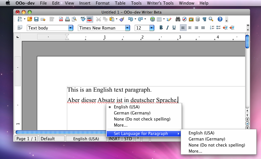 Language Selector in Writer ToolbarThe language selector tool makes assigning different languages to different paragraphs very simple. Thus; editing and spell checking documents that are written in more than just one language becomes very easy. |
