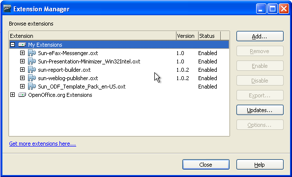 OpenOffice.org Extension RepositoryIf you have not found your favourite feature in OpenOffice.org yet, you should check out the OpenOffice.org Extension Repository. Many new extensions get added to the repository every month. Thus, it is very likely that you will find a cool new feature in the extension repository. A few examples of extensions are listed below. |